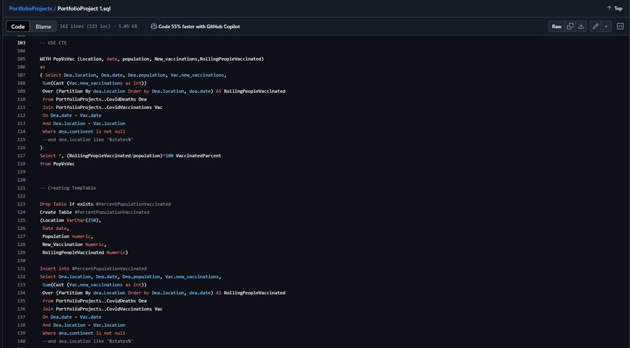 * Computed vaccination percentage = (rolling people vaccinated / population) * 1006. Temporary Table & View Creation* Built a temp table #PercentPopulationVaccinated for reuse.