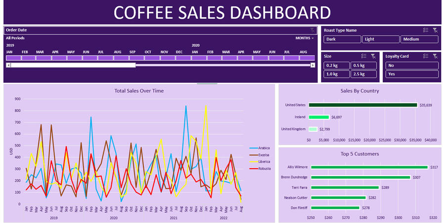 * Roast Type, Size, Loyalty Card: Allows dynamic segmentation by product characteristics and customer types.---π Key Insights* United States is the dominant market, contributing over $35,000 in sales.